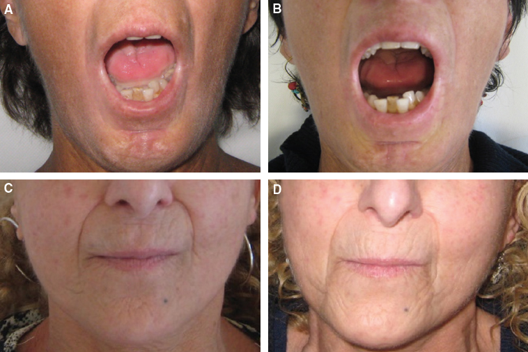 The results for three SSc patients who underwent microfat grafting are shown at 6-month follow-up. In this 47-year-old patient with a diffuse cutaneous form of the disease, microfat grafting improved her ability to open her mouth (A and B). A 58-year-old patient with a limited cutaneous form of the disease (C and D).