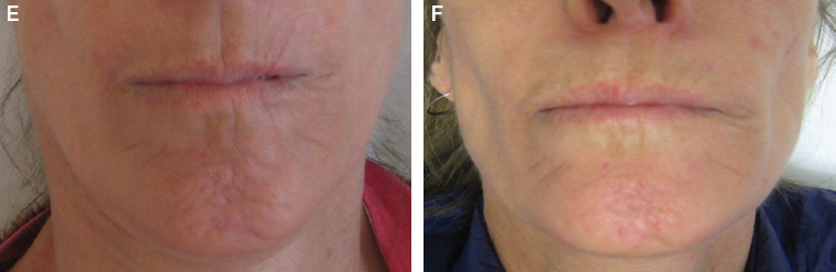 A 51-year-old patient with a diffuse cutaneous form both show a decrease in the vertical furrows around their mouths caused by retraction of the skin and trophic effects (E and F). The aesthetic improvement is evident in each woman.