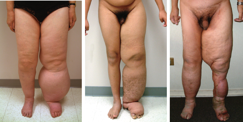 FIG. 26-1 These three clinical cases represent advanced stage (clinical stage III) lymphedema with increasing morbidity by dermatolipofibrosis with chronic inflammation and persistent bacterial and fungal infections. When lymphedema reaches this end stage, it often becomes a life-threatening condition, with recurrent sepsis.