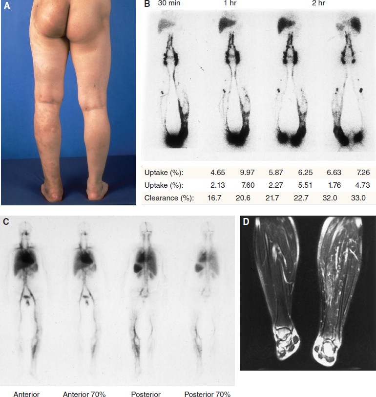 FIG. 26-2 A, Left lower extremity with primary lymphedema caused by a combination of truncular LM and venous malformation, resulting in a discrepancy in leg length. Primary lymphedema was confirmed with extensive dermal backflow/lymph stasis shown in LSG. B, An infiltrating extratruncular venous malformation was also confirmed along the left lower leg, seen here in whole-body blood pool scintigraphy. C. It was also confirmed by the MRI. D, Such a combination of various vascular malformations warrants precise assessment of the lymphatic system with LSG, not only for the initial diagnosis, but also for the follow-up assessment of treatment and its natural course and progression.