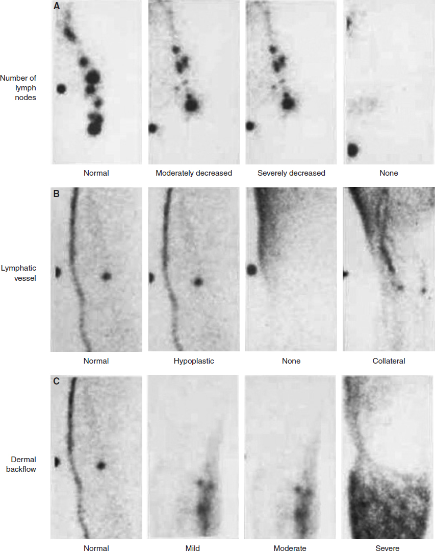 FIG. 26-3 Criteria for the qualitative analysis of LSG. A, The number of lymph nodes (normal, moderately decreased, severely decreased, or none visible). B, The condition of the lymphatic vessels (normal, hypoplastic, none, or collateral). C, The extent of dermal backflow (normal, mild, moderate, or severe).
