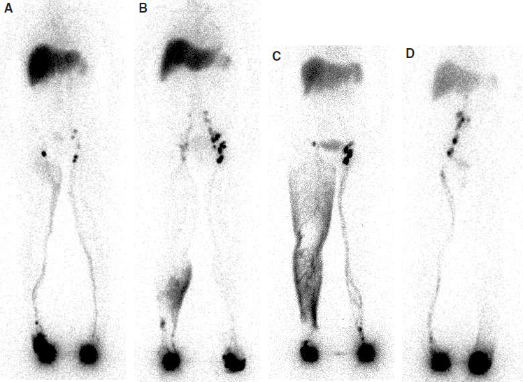 FIG. 26-4 A, Right lower extremity in grade I LSG stage of lymphedema with mildly decreased lymphatic transport function. Decreased lymph node uptake, localized/minimum lymphatic retention, and dermal backflow are seen on a 2-hour image, although the main vessel still appears normal. On the contrary, the left lower extremity shows no evidence of lymphedema—grade 0 LSG stage with normal lymph node uptake, no dermal backflow, and well-visualized main lymphatic vessels. B, Right lower extremity in grade II LSG stage of lymphedema with partial lymphatic obstruction. Image shows much decreased lymph node uptake, a significant amount of dermal backflow exceeding one half of the extremity (grade IIB), scanty collateral lymphatics, and almost no visualization of the main vessel. C, Right lower extremity in grade III LSG stage of lymphedema with severe lymphatic obstruction. Image shows no lymph node uptake, nonvisualization of the main lymphatic vessel, and a significant amount of dermal backflow. D, Left lower extremity in grade IV LSG stage of lymphedema with nearly nonfunctioning lymphatics. Image shows no lymph node uptake, nonvisualization of the main lymphatic vessel, and no dermal backflow.