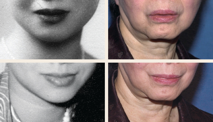 In comparing her youthful photographs to recent ones, the transverse neck creases clearly visible in both old photos have deepened with age and are interrupted by the inferior extensions of vertical platysma bands. In addition, there has been a remarkable diminution in the size of her lower lip, much more than in her upper lip.