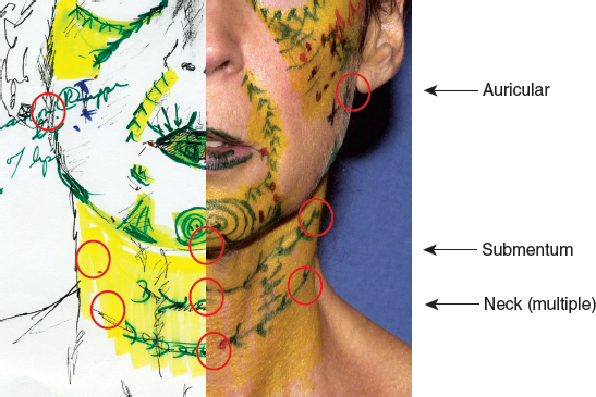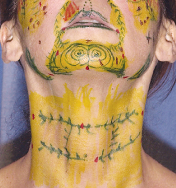 This patient’s neck was marked with borders of placement as delineated by the yellow marks. The places where I planned to place more tissue, such as lateral to the neck cartilages, were marked in green, and the incision sites in red.