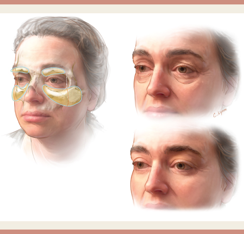 Analysis of a patient′s pictures at a youthful age also reveals that most patients experience a loss of volume in the malar area, especially in the anterior part, even those who have gained some weight in recent decades. The malar area typically supports the lower eyelid; therefore volume loss in this area will accentuate the appearance of the “bags” in the lower eyelid. In traditional lower eyelid blepharoplasty, fat is removed from the medial, median, and lateral compartments, with or without suspension of the orbicularis muscle and trimming of the lower eyelid skin.12 Although the bulging of the lower eyelid is temporarily corrected, the blending of the eyelid-cheek junction is seldom improved, especially as further deflation of the malar area takes place with aging.
