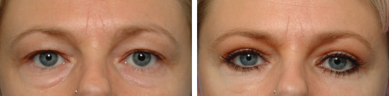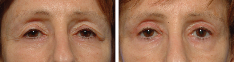 Classic resection blepharoplasty removes the apparent excess of upper eyelid skin and orbicularis muscle with or without emptying of the medial and lateral fat compartments.9,10 This approach will rarely restore the features of youth if volume loss is not addressed. A browlift traditionally completes the classical resection blepharoplasty.11 In most cases, however, a hollowing of the upper eyelid occurs with ongoing aging. Therefore the postoperative result does not always resemble the full upper eyelids most patients have in their 20s and 30s.