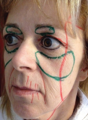 Fig. 3-5 The facelift and temporal lift are marked first. After the eyelid skin excision is marked in red, the areas of microfat grafting of the infrabrow area and the tear trough and malar area are marked in green.