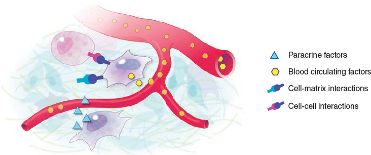 The physiology of any cell is strictly regulated by the interactions that it establishes with its microenvironment (niche). These interactions involve physical communications with neighboring cells or the surrounding extracellular matrix and the binding of circulating or paracrine factors released by distant or local cells, respectively. In other words, the niche concept, which originally referred to interactions between species and their environment in the context of the whole ecosystem, can be extended to describe the complex relationships inside a single organism that allow any cell to survive, grow, differentiate, and reproduce.