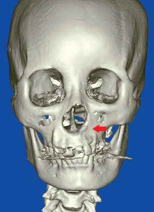 This three-dimensional CT construction shows the bone atrophy in the left side of the face in an RD patient.