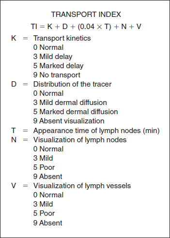 A score of less than 10 signifies a normal transport index, and a score equal to or greater than 10 signifies a pathologic transport index. Scores are determined bilaterally, even in patients with unilateral swelling. (Other diagnostic and preoperative considerations are discussed in the Surgical Techniques section.)