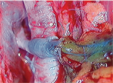 FIG. 33-3 The passage of blue lymph into the vein branch can be seen under the operating microscope, which verifies the patency of the anastomosis.