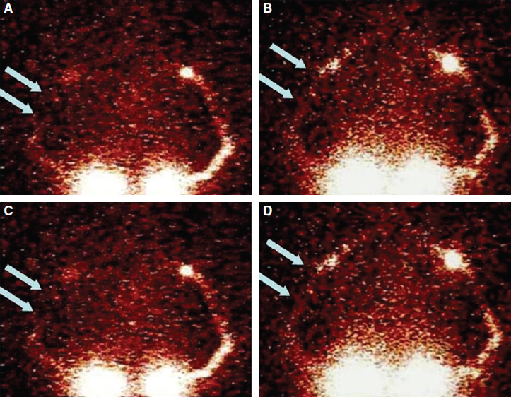FIG. 33-4 Preoperative (A and C) and postoperative (B and D) lymphoscintigraphy of the upper limbs in a patient treated with MLVA. Note the appearance of preferential lymphatic pathways after surgery. The arrows show the lymphatic flow in the right arm. In B and D, the areas of greater lymphatic flow are indicated by a thicker white line and a concentration of white pixels corresponding to the lymph node(s), providing evidence of the new lymphatic pathways that were created surgically in that arm.