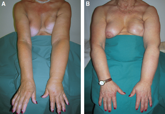 FIG. 33-5 A, This woman is seen preoperatively with lymphedema of the left arm (stages 2A and 2B) after mastectomy. B, Follow-up 5 years after surgery.