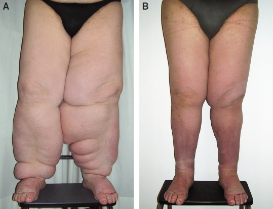FIG. 33-6 A, This man had elephantiasis before surgery. B, Long-term stable results are shown after MLVA and appropriate weight control at 5-year followup.