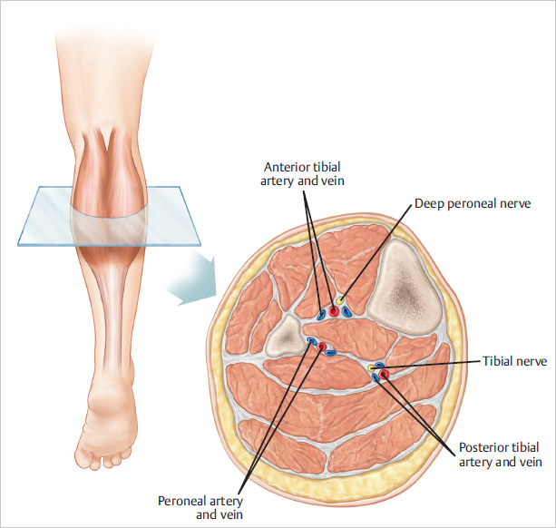 Fig. 35.3 Major neurovascular structures are seen in this cross-section of the midportion of the calf. When performing a subfascial augmentation (as is our standard), these structures are relatively safe from injury.
