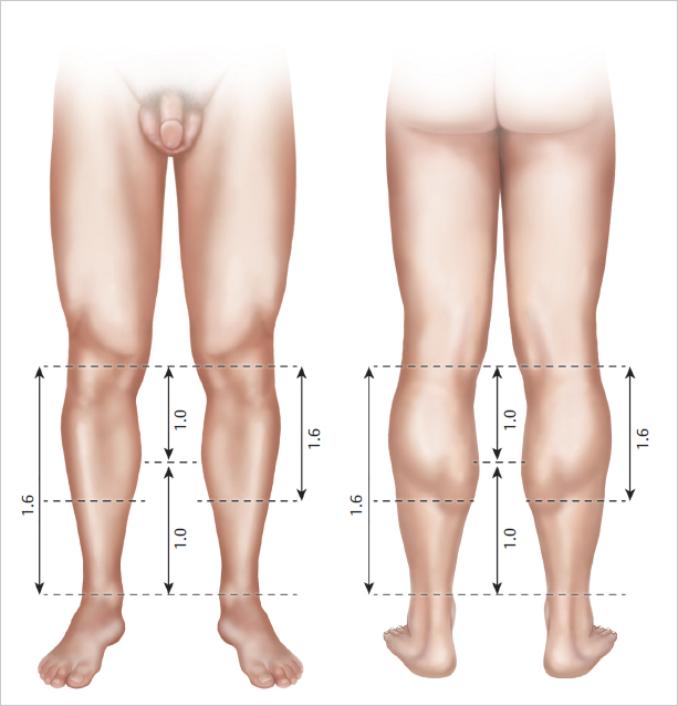 When considering the calf anatomy, one must also consider proportions of the body and aesthetics of the calf region. Over the years, physicians and mathematicians have tried to define beauty and what constitutes a beautiful male form. In 1991, Howard9 first described the ideal length proportions of the calves, basing his paper’s conclusions on drawings done by Leonardo da Vinci. Howard defined the golden ratio of calf aesthetics to exist when the distance between the ankle and the lower border of the gastrocnemius muscle was equal to the distance between the knee and the most prominent point on the medial curvature of the gastrocnemius muscle; the entire length of the gastrocnemius should be 10.6 times the former value. 9 This golden ratio correlated to the golden section of 1:1.618 as defined by the Italian mathematician Bonacci or what German astronomer and physicist Johannes Kepler called the “divine proportion” 9 ( Fig. 35.4 ). Using these “standards” of calf aesthetics, one can better understand the defect that needs to be corrected and improved with a properly chosen implant.