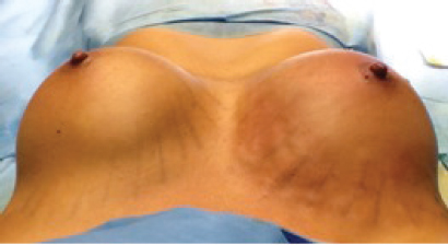 This is a superior intraoperative view of a patient undergoing CBA. One can see the powerful effect of fat grafting on the right breast; the contours of the implant are not visible, and the breast’s contour and cleavage are improved.