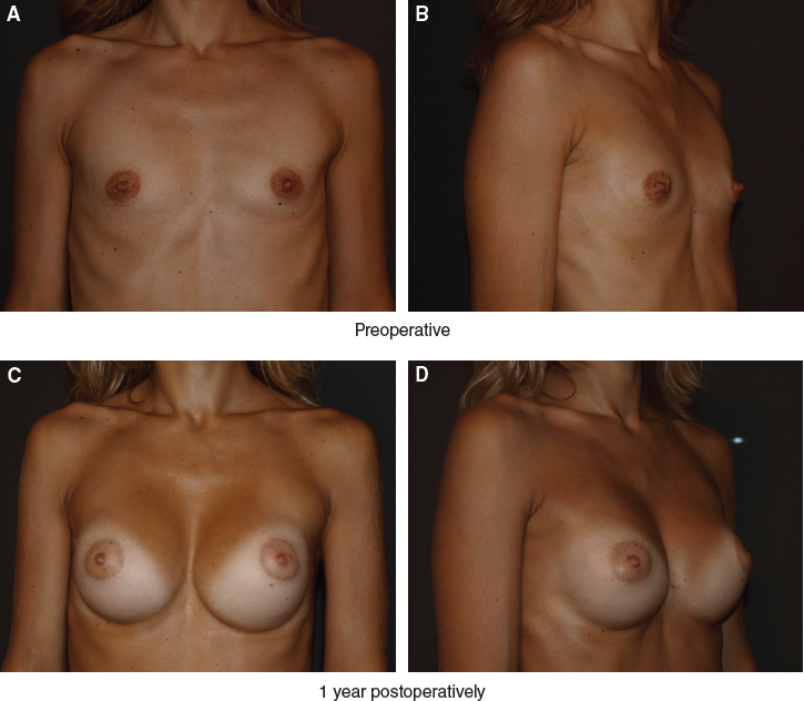 This 28-year-old patient presented with obvious breast hypoplasia. She underwent breast augmentation with 240 cc round implants placed bilaterally in a subfascial plane through a transaxillary approach. In addition, 70 cc of fat was grafted into each breast.