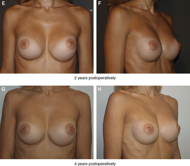 The introduction of new-generation cohesive silicone gel implants resulted in prostheses with improved shell coverage and reduced silicone bleed. Surgeons rapidly observed a significant decrease in the appearance of rippling, and we were able to use anatomic shaped implants. This resulted in the introduction of premuscular, subfascial implant positioning, as described by Graf et al 5 and Góes and Landecker. 6 The first presentation by Delay et al 7 at a French Congress in 2008 introduced the use of isolated fat grafting for aesthetic breast augmentation. Since this revelation, breast surgeons have begun to use fat grafting in combination with implants to improve aesthetic outcomes, particularly in thin patients with inadequate soft tissue coverage.