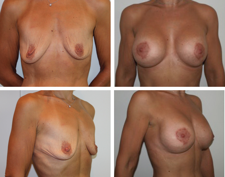 This patient had a significant weight loss of 50 kg that led to breast atrophy, ptosis, and skin excess. She underwent CBA in which 360 cc round implants were placed, and 120 cc of fat harvested from the thighs was grafted in each breast. She is seen 1 year postoperatively. CBA is particularly useful in augmentation mastopexy, where skin tightening is one of the main goals of the operation, the second aim being to provide volume. Through the use of fat grafting in the subdermal layer, CBA allows skin tightening by providing additional coverage between the implant and skin.