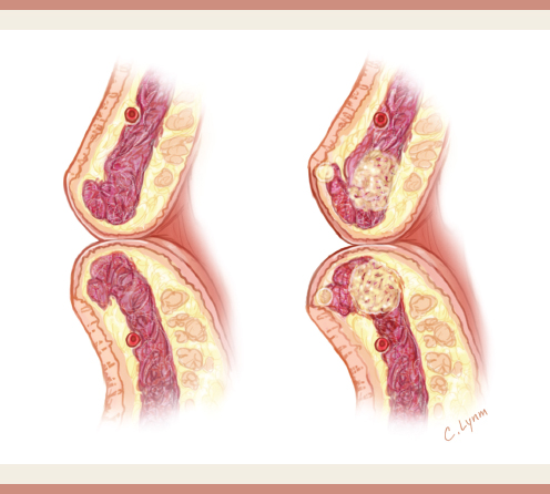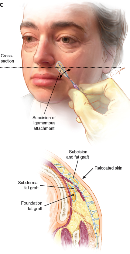 This procedure cuts all the ligament attachments from the skin to the deeper structures (Fig. 4-3). A small volume of microfat (0.3 to 0.5 cc) is then injected into the created cavity, not as much as a filler but rather as a spacer to prevent reattachment of the skin to the deep tissues.