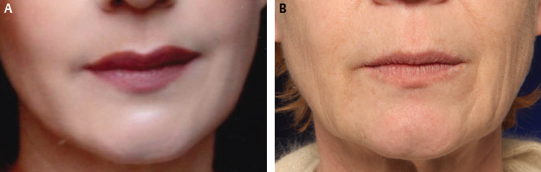 Aging of the perioral region involves the accentuation of the nasolabial crease and fold; changes in skin texture with the appearance of perioral rhytids (barcode); atrophy of the vermilion volume; loss of definition of the vermilion border, white roll, and philtrum; and increase in vertical height of the upper lip between alar base and vermiliocutaneous border (Figs. 4-1 and 4-2). Remarkably, this lengthening of the upper lip is the only region in the central part of the face where “sagging” is obvious, observed in long-term photographic studies of facial aging. The treatment plan is multimodal by combining fat grafting, resurfacing techniques, and surgical liplift. The combination of these techniques is another example of synergy in the rejuvenation of the perioral area.