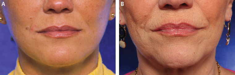 Aging disturbs these parameters to a certain degree: The vermiliocutaneous border loses its definition and flattens out. The definition of the Cupid′s bow fades in the frontal view. The projection of the upper lip decreases and becomes level or even posterior to the lower lip. The contour from the nasal base to the vermilion border becomes straight to convex because of lengthening of the lip and subsequent inversion of the vermilion. The philtral columns lose prominence and definition. The oral commissures tend to turn downward. The vermilion mucosal surface becomes dryer and atrophic and loses turgor. The skin surface becomes rough, pigmentary irregularities occur, and vertical rhytids appear (the barcode appearance).