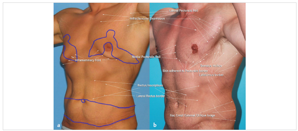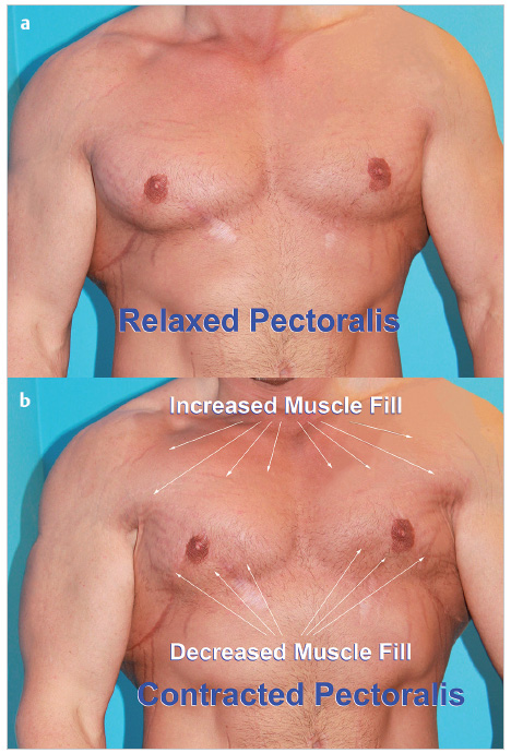Surgically relevant aesthetics starts with an appreciation of dominant broad shoulders and rib cage draped with bulging sheets of contoured muscles that taper to a narrow waist highlighted by a six-pack abdomen and narrow rounded buttocks ( Fig. 40.1a ). Our muscular model is a 5 foot 10 inch, 185-pound part-time fighter. Three years earlier, he had lost 100 pounds followed by boomerang pattern correction of gynecomastia extended with a short transverse upper body lift, and an abdominoplasty extended with a transverse lower body lift ( Fig. 40.1b ). There is heightened muscular show covered with faded scars on the chest and lower torso. Replacement of the gynecomastia and loose chest skin reveals subtle contours of the pectoral muscle that change with arm position and active contraction ( Fig. 40.2 ).