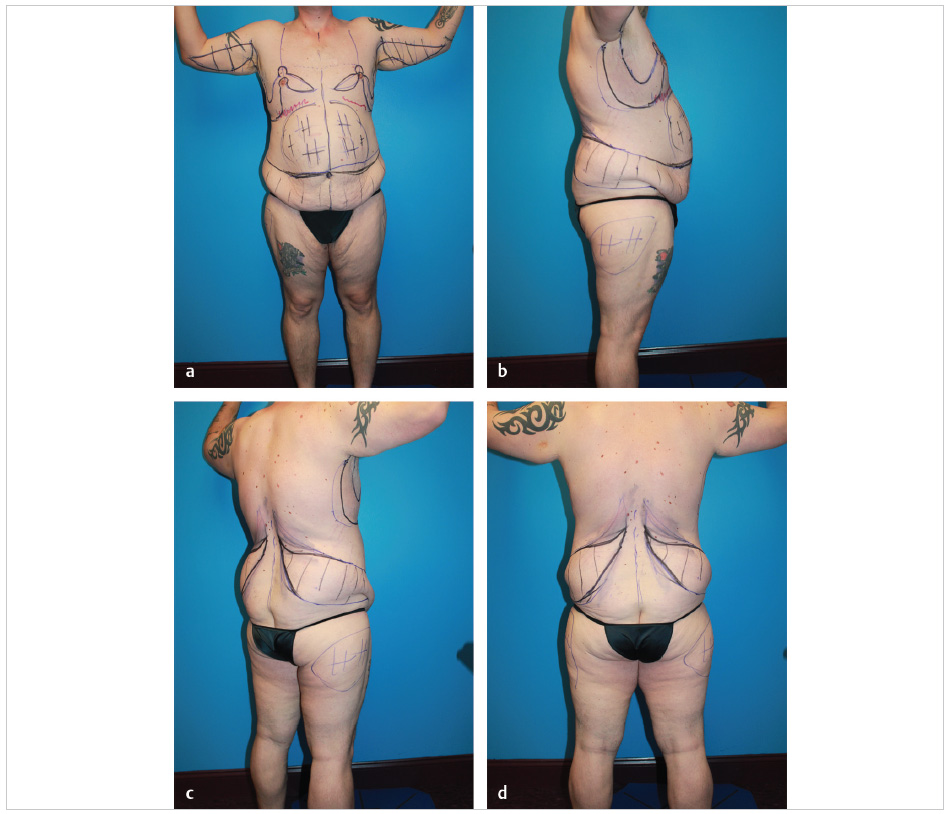 This demanding surgery is scheduled no sooner than 1 year after weight loss is stable. The anticipated residual subcutaneous tissue needs to be thin enough to reflect underlying muscle. If that has not been achieved, then further weight loss or focused liposuction is necessary. The patient needs to be physically fit with good nutrition as determined by history, physical examination, and screening laboratory tests.