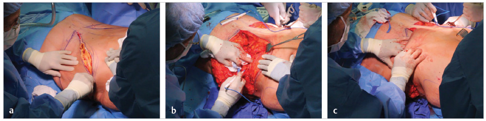 The arm hemiellipse is set for closure using No. 1 PDO Quill placed in a running horizontal pattern followed by an intradermal 3–0 Monoderm. By then, the assisting surgeon will have completed the VASERlipo of the epigastrium, isolated the umbilicus, and directly undermined a 6-cm-wide path along the epigastrium midline ( Fig. 40.4c ).