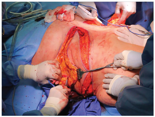 Indirect undermining of the remaining epigastrium is through spreading the LaRoe dissectors (ASSI). Then the epigastric flap is pulled down to the planned lower abdominal incision. Because the marked lower incision for the boomerang pattern excision did not move inferiorly by the simulated abdominoplasty closure, that incision can be safely made next.