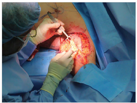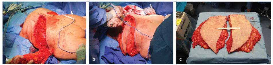 Once the perimeter incision is completed, the resection of the excision site is begun from posterior to lateral ( Fig. 40.6a ). As the excision plane is taken directly over the lumbodorsal fascia to the external oblique, the resection thickness progressively widens to end at the lateral torso at the operating room table ( Fig. 40.6b ). Usually, the resection is completed by electrosurgical cut from the dermal side. Preliminary epinephrine infusion and electrocautery as you go keep blood loss to under 100 mL per side. The surgeon periodically observes the progress of the opposite side team, guiding them through a symmetrical resection. To demonstrate the incredible size and symmetrical thickness of the flank excisions, the two resection specimens are laid out with a 16-cm ruler ( Fig. 40.6c ).