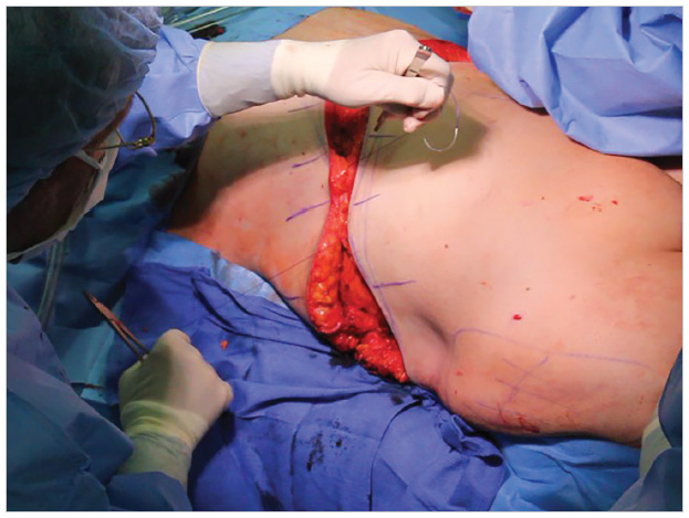 After a two-layer PDO and Monoderm Quill closure of the boomerang pattern, the surgeon confirms the proper width of lateral vertical chest excision. Incision of the anterior limb of the J torsoplasty completes the perimeter allowing for the cutout. Two-layered barbed suture closes the uneven sides of the J torsoplasty and completes the operation under moderate tension. Imperfections in skin alignment are corrected with fine skin sutures.