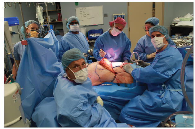 The operation starts prone for excisions of the oblique flank extensions of the abdominoplasty. Prone followed by supine positioning facilitates twoteam surgery. A two-team approach is preferred and probably obligatory to reduce the time of surgery for a lengthy total body lift. The operating surgeon leads the first team and supervises the second team. The operator for the second team, who has previously assisted the surgeon, watches the first 10 minutes of the opposite side and then makes his incision. The second team working 10 minutes later than the first is most efficient. That delay coupled with continuous communication encourages a symmetrical result in breadth and depth of resection as well as closure. Through several nick incisions, saline with xylocaine and epinephrine is generously infiltrated about the incisions and deeply over the lumbodorsal fascia of the two excision sites.