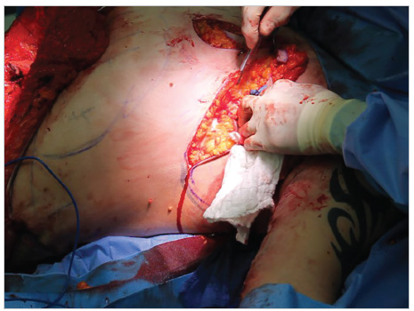 The anchor 2–0 Vicryl stitch is placed through the deltopectoral fascia at the apex of the wound and then through the subcutaneous fascia of the proximal posterior triangular flap and tied.