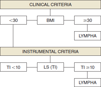 The indications for the LYMPHA technique were based on clinical and lymphoscintigraphic parameters (Fig. 40-1). It is well known that obesity predisposes an individual to lymphedema, and therefore patients with a BMI higher than 30 were considered at high risk for lymphedema and candidates for LYMPHA. Patients with a normal BMI were studied with lymphoscintigraphy, which indicated latent lymphatic impairment still not evident clinically.