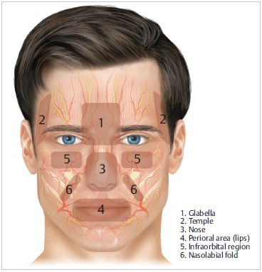 Fig. 41-1. Facial danger zones for injectables in the male patient. One must pay particular attention in the areas of the glabella, the temple, perinasal, perioral, infraorbital, and nasolabial areas. These areas should only be injected by experienced injectors and should not be overfilled. Also, careful, standard safe practices of injecting including small aliquots, testing “pullback” to ensure not in a vessel, and “reverse injections” should be practiced. An injection “crash cart” including hyaluronidase must be in every office to be able to responsibly handle any acute changes in the tissues during or after injections.
