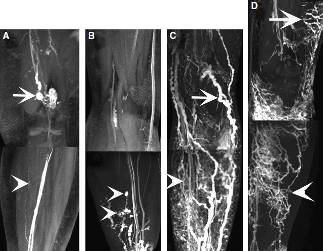 FIG. 45-2 Composition images of MR lymphangiograms show various lymphatic drainage pathways in primary lymphedematous limbs. A, Single deep lymph vessel (arrowhead) and popliteal nodes (arrow) were enhanced to show the absence of a superficial lymph vessel. B, Enhanced lymph vessels with cystic dilation (arrowheads) in the distal part of the leg. C, Both superficial lymphatics (arrowhead) and deep lymph vessels and popliteal nodes (arrow) were involved. D, A crisscross network of hyperplastic vessels in the thigh (arrow) and calf (arrowhead) are evident.