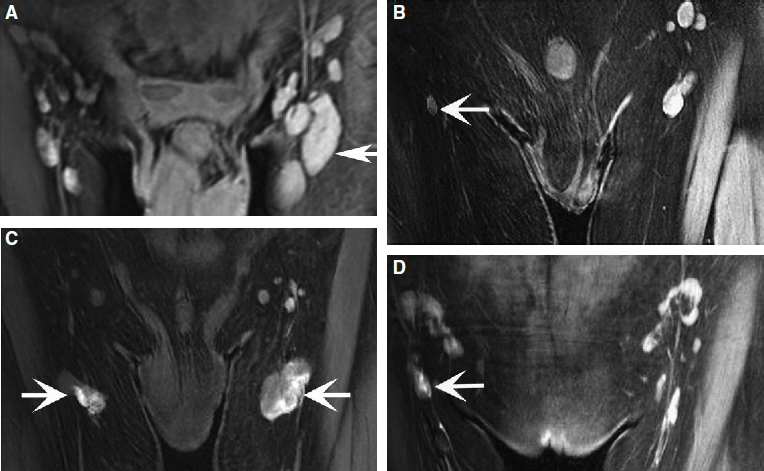 FIG. 45-3 Diverse inguinal node abnormalities of primary lymphedematous limbs visible on MR lymphangiograms. A, Enlarged inguinal lymph nodes (arrow) with homogeneous texture in the left side compared with lymph nodes of normal size in the right side. B, Single small node in a limb (arrow) with lymphatic hypoplasia and lymphedema is compared with lymph nodes in a limb without lymphedema. C, Partially contrast-enhanced inferior inguinal nodes (arrow) in bilateral lymphedema with secondary lymphatic dilation. D, Central part enhanced inferior inguinal node (arrow) compared with evenly enhanced contralateral healthy nodes.