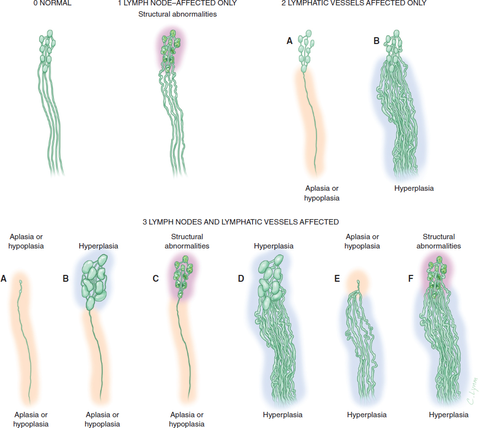 FIG. 45-4 Updated classification of lymphatic system malformations in primary lymphedema. In lymph node–affected only classification, some moderate dilation of afferent vessels may also be present. 0, Normal. 1, Lymph node affected only. 2, Lymphatic vessels affected only: A, Lymphatic aplasia/hypoplasia; B, lymphatic hyperplasia. 3, Both lymph node and lymphatic vessels affected: A, Lymphatic and nodal aplasia or hypoplasia; B, lymphatic aplasia or hypoplasia plus nodal hyperplasia; C, lymphatic aplasia/hypoplasia plus nodal structural abnormalities; D, lymphatic and nodal hyperplasia; E, lymphatic hyperplasia plus nodal aplasia or hypoplasia; F, lymphatic hyperplasia plus nodal structural abnormalities.