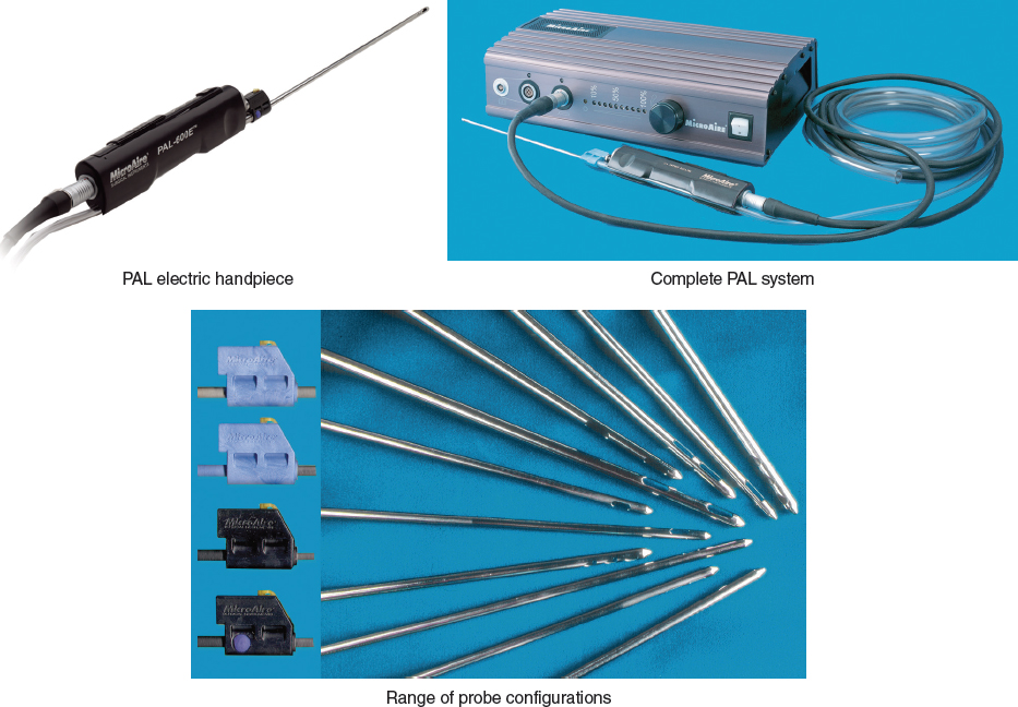 I perform all my cases with a power-assisted liposuction (PAL) machine (MicroAire, Charlottesville, VA). This equipment has an electrically powered reciprocating cannula (4000 to 6000 cycles per minute) that makes suctioning much easier and less tiring for the surgeon. The machine works quite well and speeds up the liposuction process. The system does not use heat; however, if the operator is not careful, friction skin burns can occur that will not be detectable for at least 2 to 3 days after surgery.
