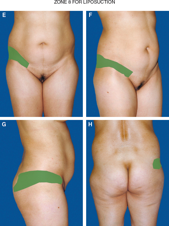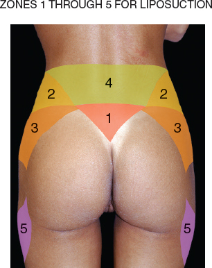 Also on the day of surgery, in the holding area, the patient is marked while standing. The areas to be liposuctioned are identified; these always include zones 1 through 4 and the areas over the oblique zones. 2 Zone 5 has cultural ramifications: some patients desire fat added in that area, whereas others request that fat be removed from this region.
