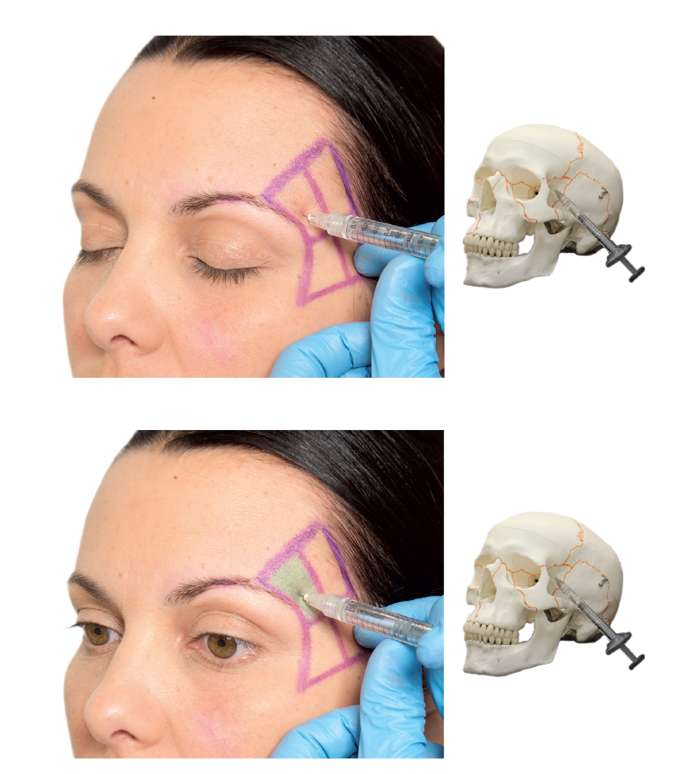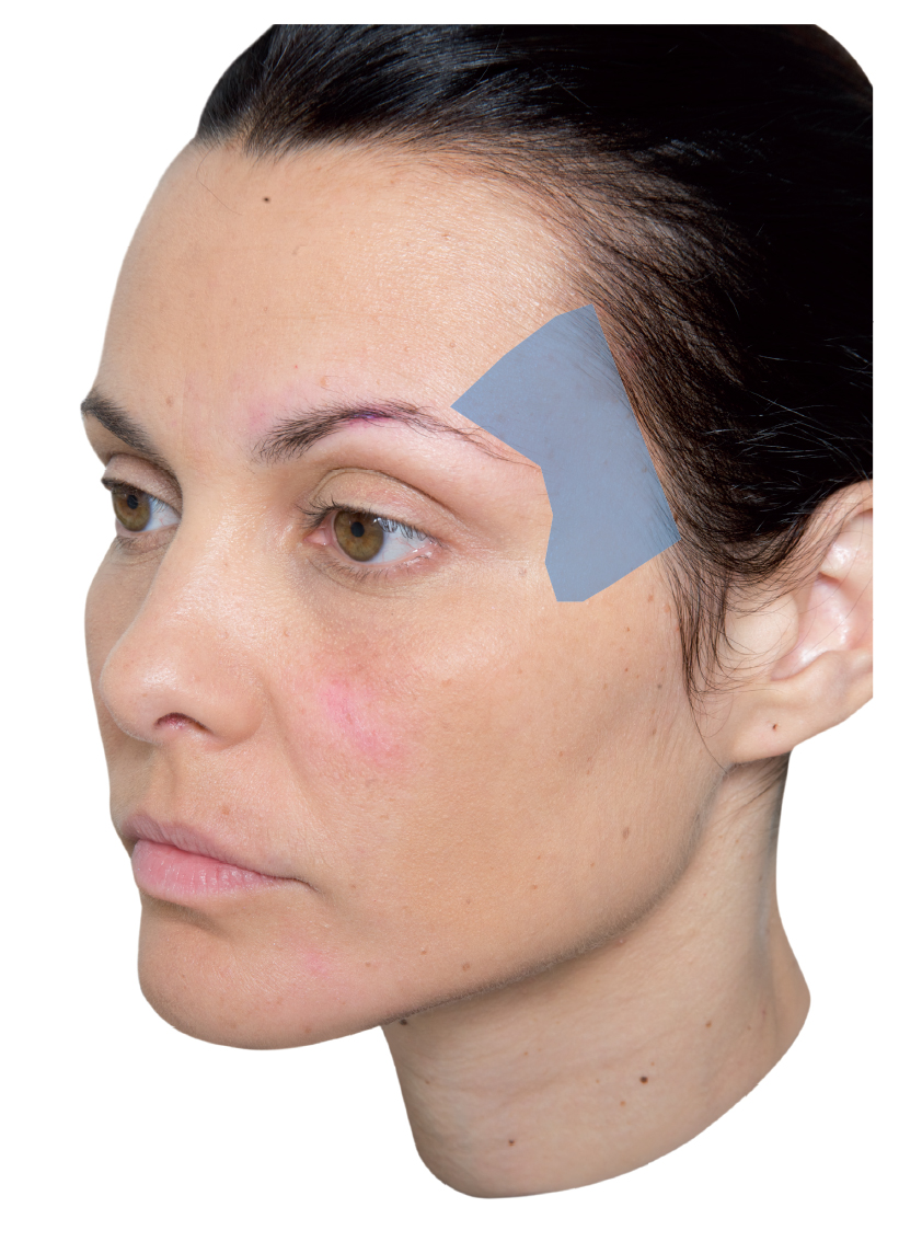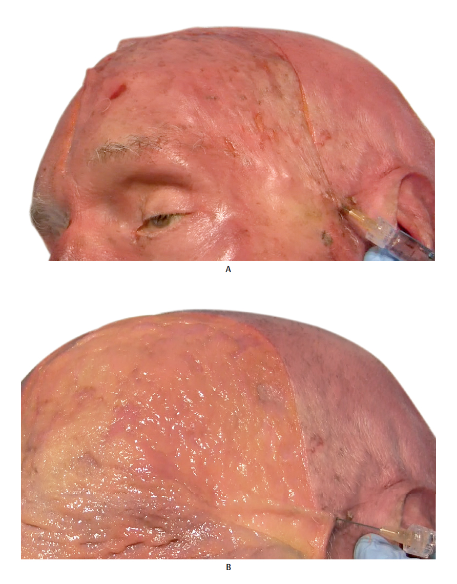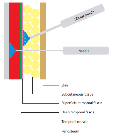 Treating the temporal region is a challenge because the local skin is thin and tends to form irregularities after injection. Lambros 1 presented an alternative technique for filling the subcutaneous plane with HA diluted in physiological saline solution (PS) at a ratio of 2:1 (PS to HA). With the absorption of PS, HA is distributed more uniformly. This dilution technique, and inserting HA at this site, is considered off -label.