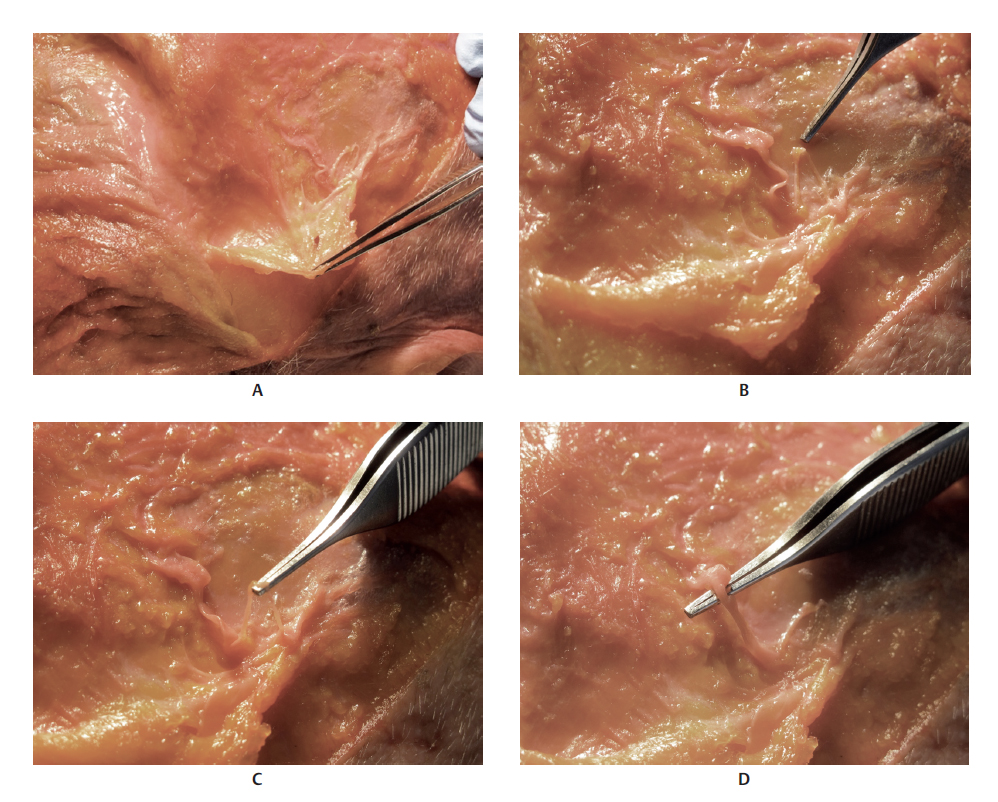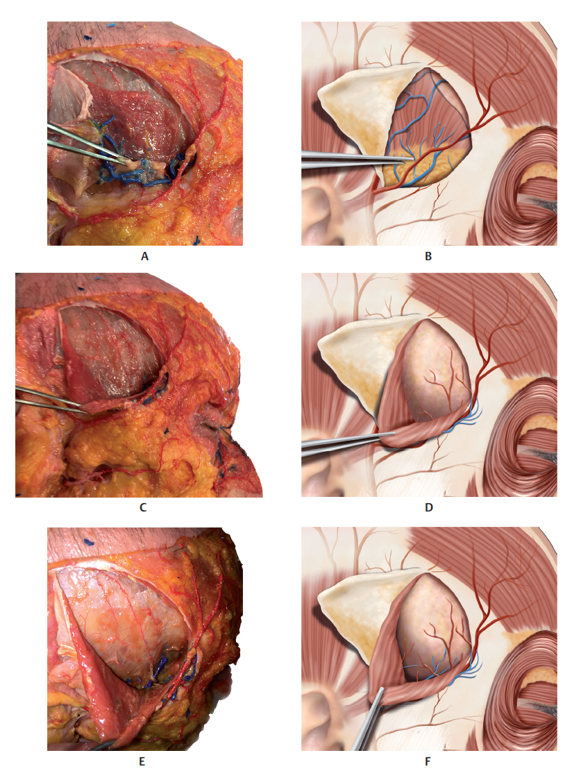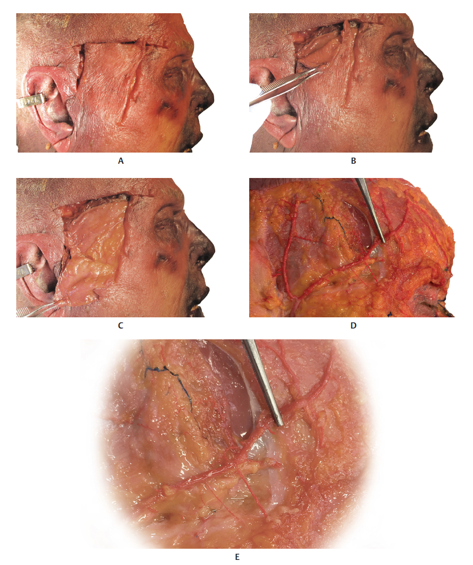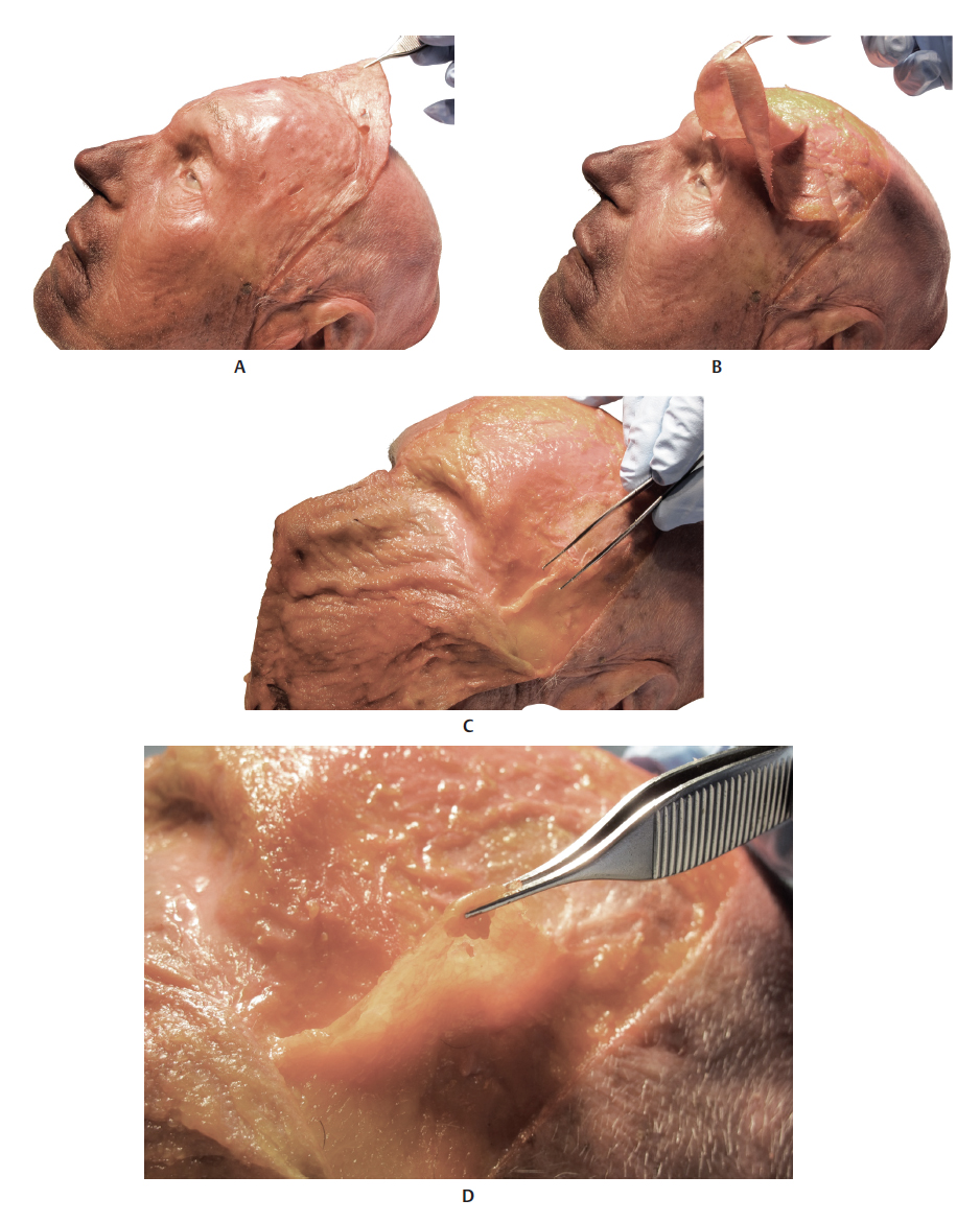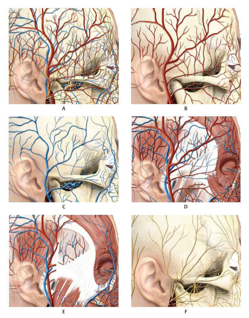 The temporal region is composed of the skin, subcutaneous tissue, superficial temporal fascia or temporoparietal fascia, temporal fat pad, deep temporal fascia (divided into the superficial and deep layers), buccal fat pad (Bichat’s fat pad), temporal muscle, and periosteum of the temporal bone (Fig. 6.4–6.7 and6.10–6.19). 3