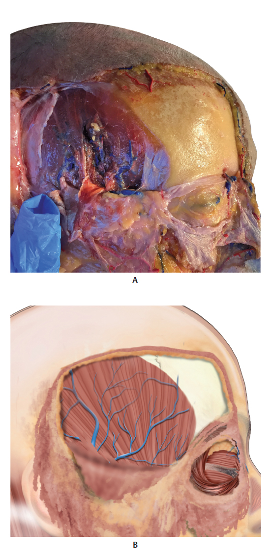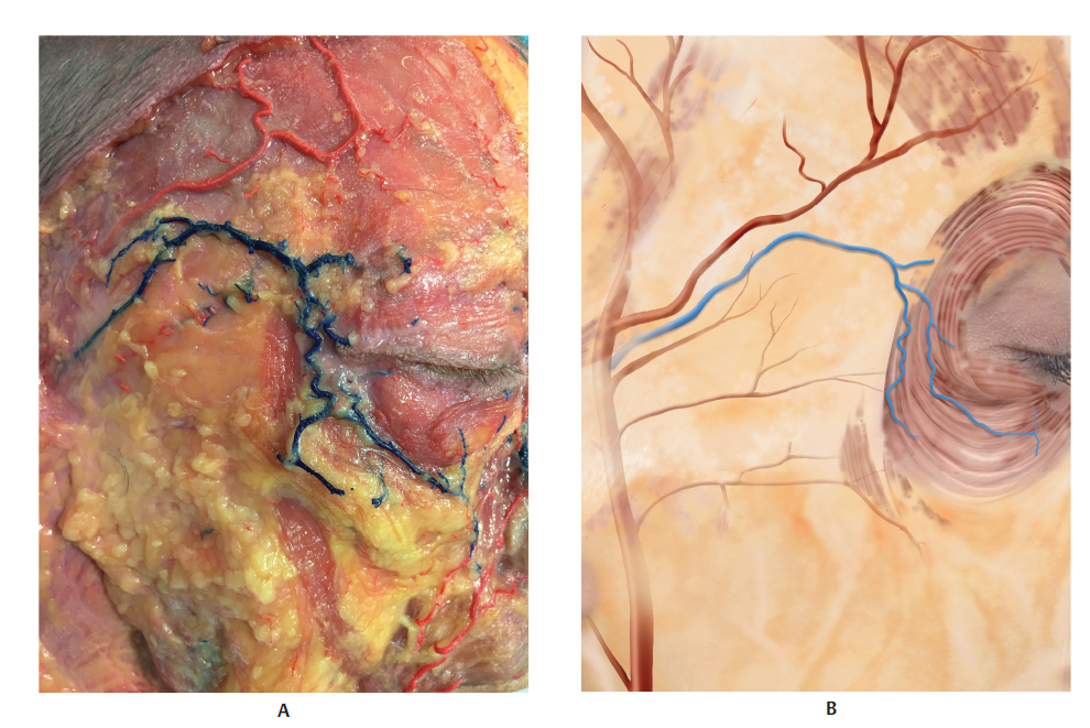 The periorbital veins, the frontal branch of the superficial temporal vein (STEV), the branches that drain from the temporal muscle, the zygomatico-orbital and zygomaticotemporal veins, and the sentinel vein drain to the middle temporal vein (MTV), which crosses the temporal region between the superficial and deep layers of the deep temporal fascia. The MTV anastomoses with the STEV above the zygomatic arch and connects with the cavernous sinus through the periorbital veins, which is why there is a risk of embolization in the cavernous sinus after intravenous injection. 4 ,. 5