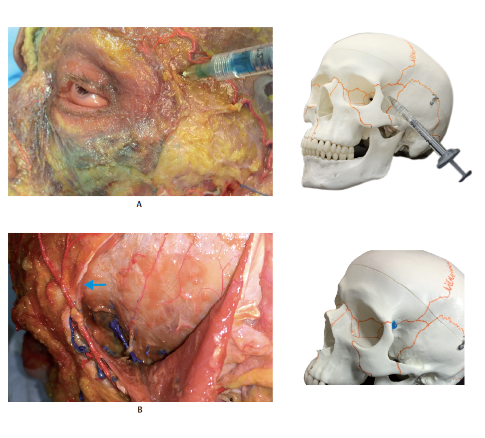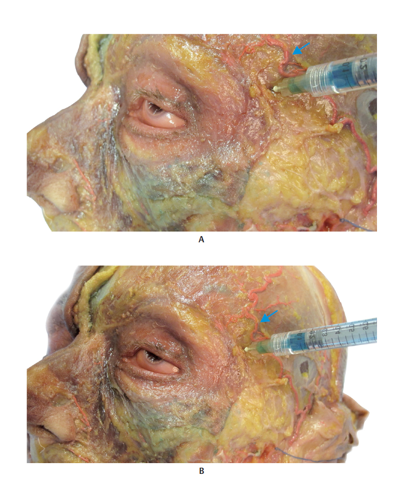 The superficial temporal artery (STA) and the deep temporal artery supply this region. The STA is the smaller of the two terminal branches of the external carotid artery. It originates in the parotid gland, posteriorly to the neck of the mandible, and crosses the zygomatic arch about 10 mm anteriorly to the tragus. It divides into the transverse facial artery, the zygomatico-orbital artery, and the parietal and frontal branches. It crosses the temporal region in its posterior quadrant and above the superficial temporal fascia. The deep temporal artery is a branch of the maxillary artery, the largest of the terminal branches of the external carotid. It has an anterior and a posterior branch, located between the temporal muscle and the periosteum. It is important to note that despite being a branch of the external carotid, the STA anastomoses with branches of the internal carotid, such as the supraorbital artery. Therefore, an intravascular injection could reach the internal carotid system through retrograde flow and occlude the central retinal artery. Though rare, the main complication is blindness. It is, therefore, vital to have in-depth knowledge of the local anatomy and the appropriate technique before performing any procedures in this region.