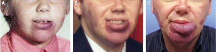 Capillary malformations can cause overgrowth of tissues beneath the cutaneous stain. A child with a CM involving the lower lip and chin is shown (A). Labial hypertrophy during adolescence is seen (B). Continued enlargement in adulthood is shown (C).