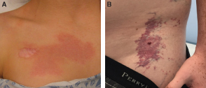 A CM begins as a pink, cutaneous discoloration and then darkens to a purple color over time. A child with a CM of the chest is shown (A). She underwent an unnecessary biopsy to diagnose the lesion at an outside institution that resulted in an unfavorable scar. The diagnosis of a CM is made by history and physical examination; imaging and histopathologic examination are not required. An adolescent male with a darkened CM of the trunk is shown (B). Note the pyogenic granuloma that has developed.