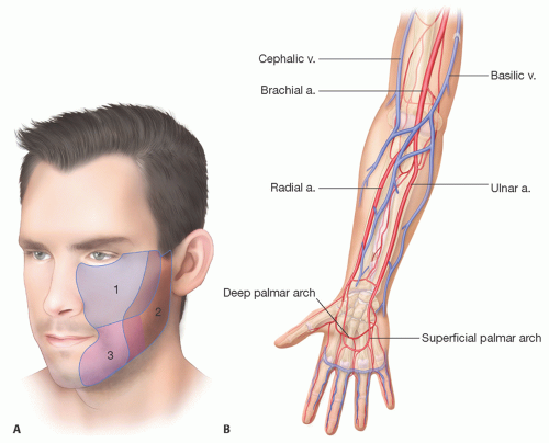 FIG 1 • A. Outlines of the zones of the cheek. Note overlap of zones. B. Arterial and venous anatomy of the forearm.