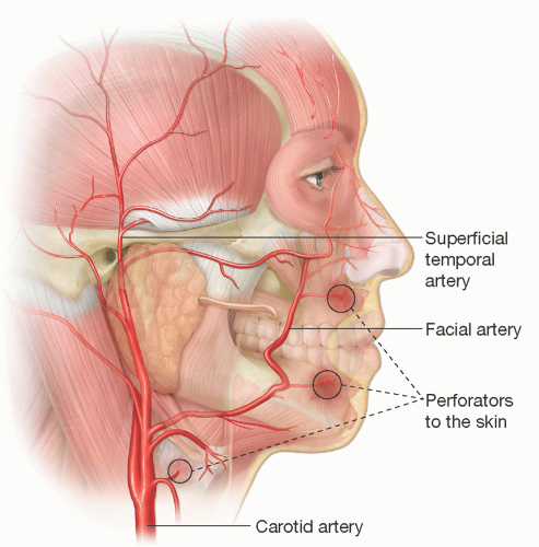 The arterial supply to the cheek is provided by the facial, superficial temporal, and transverse facial arteries originating from the external carotid artery. Venous drainage may parallel the arterial system though variations are common (FIG 2).